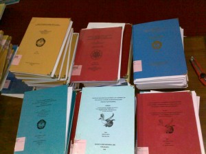 Hari ini kegiatan digitalisasi skripsi memasuki minggu ke-2. Kurang lebih 100an judul skripsi sudah selesai di pindai dan sudah dikonversi menjadi file PDF. Target pertama kegiatan ini adalah tercapainya jumlah skripsi yang selesai di pindai sebanyak 500 judul skripsi. Dari 100an judul tersebut diantaranya berasal dari jurusan Tari, Karawitan, Pedalangan, Etno, TV, Desain Interior, dan ada beberapa tesis. Dokumen-dokumen PDF tersebut nantinya akan ditambahi watermark berupa logo ISI Surakarta dan dibuatkan bookmark untuk membantu mempercepat penelusuran isi skripsi.