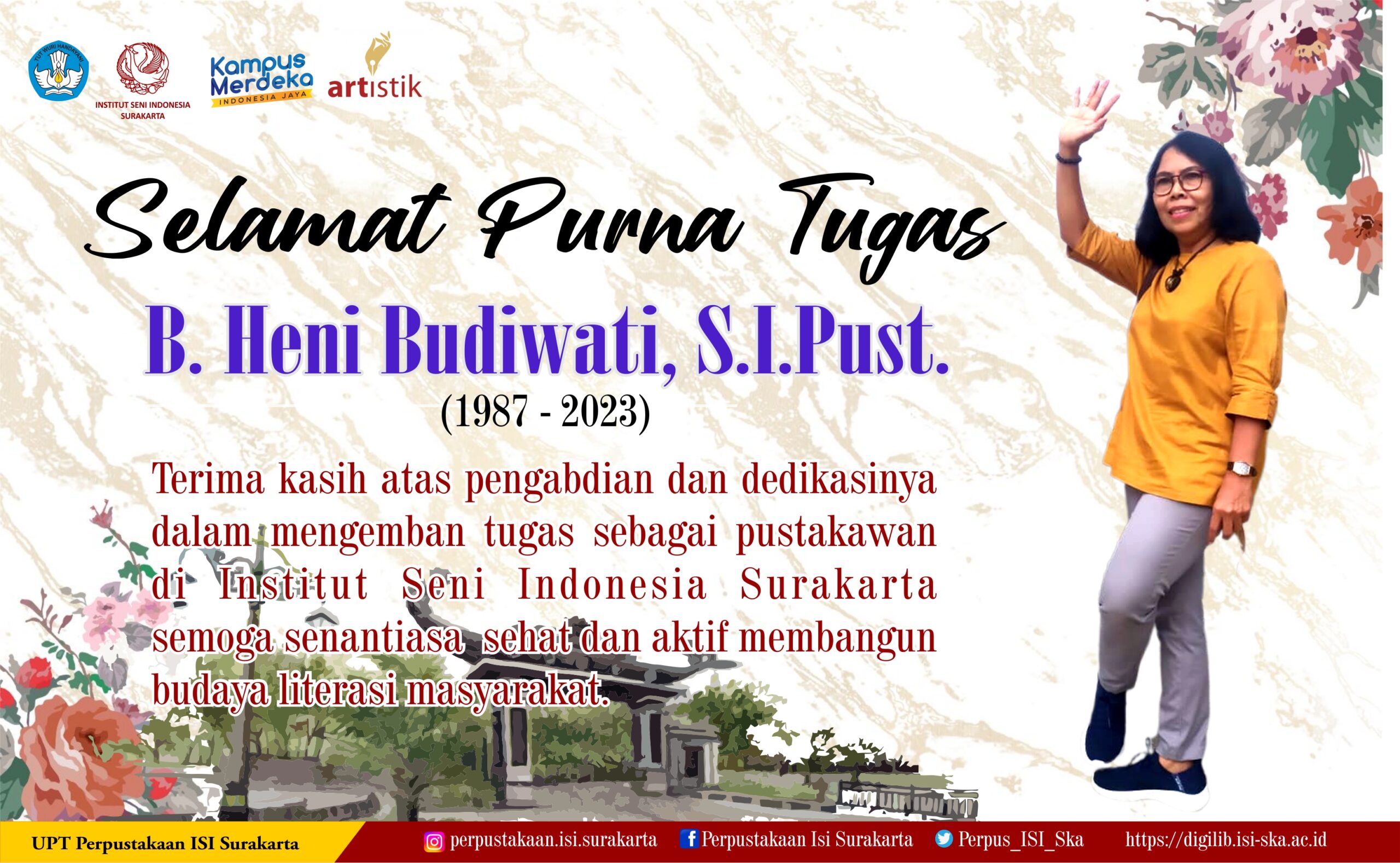 Pada hari Rabu, 31 Mei 2023 rektor ISI Surakarta, beserta jajarannya mengadakan acara pelepasan purna tugas ASN dosen dan tenaga pendidik, yang salah satunya adalah pustakawan perpustakaan ISI Surakarta, yakni ibu B. Heni Budiwati, S.I.Pust. Ibu Heni (sapaan akrabnya) purna tugas dengan masa kerja 36 tahun, dengan golongan dan jabatan terakhir adalah III/d sebagai Pustakawan Penyelia. Ibu Heni tidak lepas dengan sejarah perkembangan ISI Surakarta dari mulai ASKI, STSI, sampai saat ini menjadi ISI Surakarta. Ibu Heni di perpustakaan ISI Surakarta menjadi tombak ujung layanan perpustakaan, karena beliau bertugas di unit layanan sirkulasi, tentunya bagi pemustaka baik mahasiswa, tenaga tendik, tenaga administrasi dan dosen sudah merasakan layanan yang diberikan oleh ibu Heni dalam pemenuhan informasi yang ada di perpustakaan ISI Surakarta.