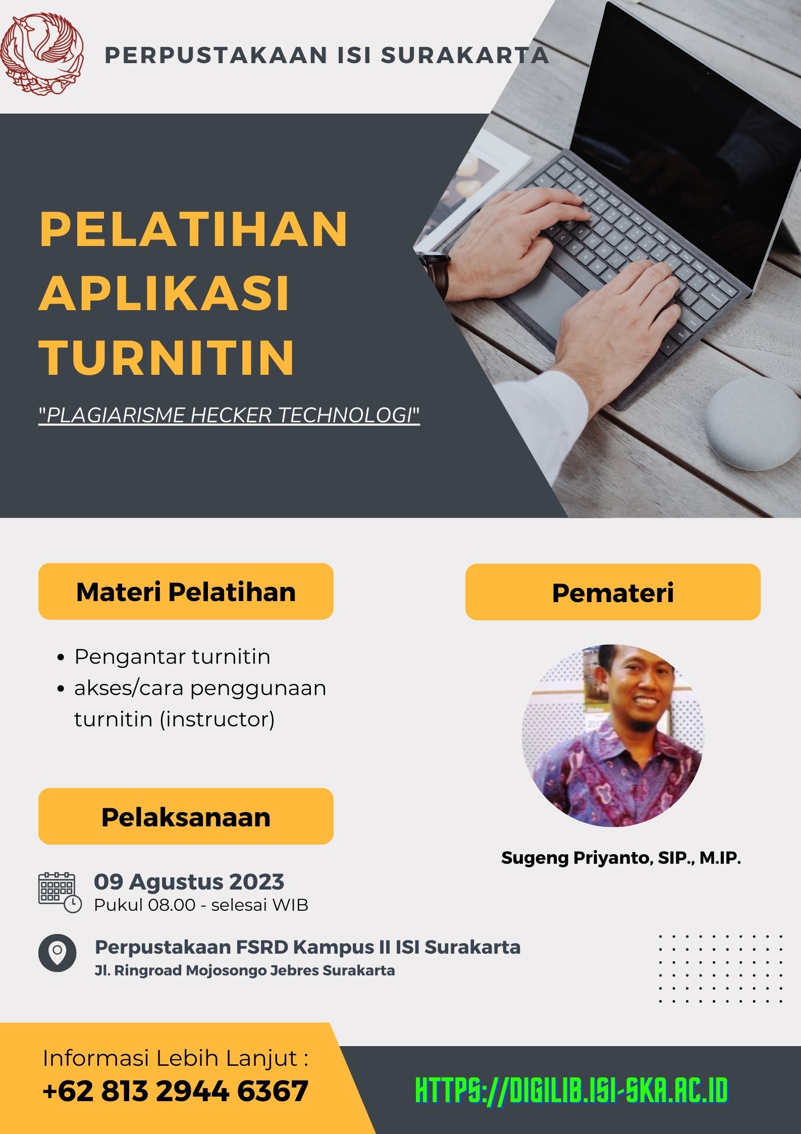 UPT Perpustakaan Institut Seni Indonesia (ISI) Surakarta menyelenggarakan Workshop Turnitin dalam rangka membantu pemustaka menemukan potensi-potensi plagiarisme. Narasumber kegiatan yakni Sugeng Priyanto, S.S., M.IP. dari UPT Perpustakaan dan Undip Press, Universitas Diponegoro Semarang. Workshop internal ini diikuti seluruh ASN UPT Perpustakaan Institut Seni Indonesia Surakarta yang terdiri 11 orang yakni 1 (satu) Kepala UPT Perpustakaan dan 10 (sepuluh) pustakawan. Workshop Turnitin berlangsung pada Hari Rabu, 9 Agustus 2023 bertempat di Ruang Diskusi Lt.1 UPT Perpustakaan Kampus II ISI Surakarta Jl. Ringroad Mojosongo, Surakarta, Jawa Tengah.