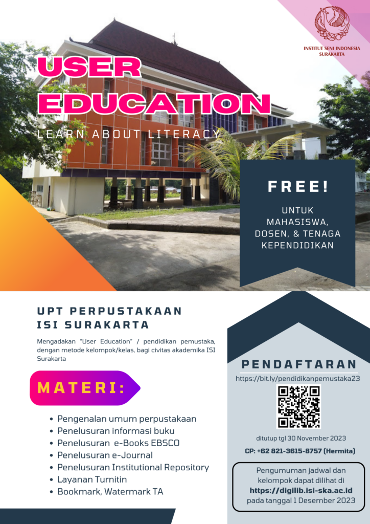UPT Perpustakaan ISI Surakarta akan melaksanakan User Education atau pendidikan pengguna yang akan dilaksanakan dengan sistem kelas atau kelompok dengan peserta mahasiswa, dosen, tenaga tendik, seluruh civitas akademis ISI Surakarta.